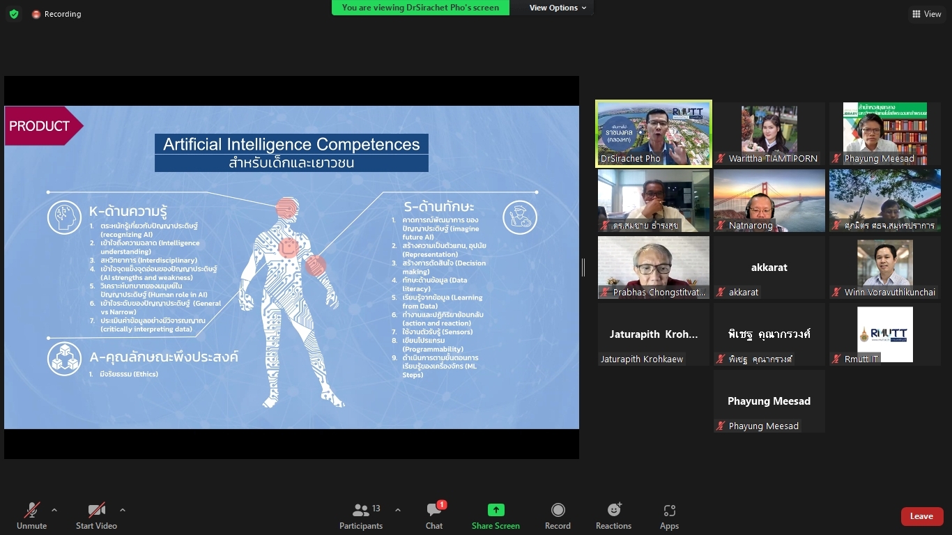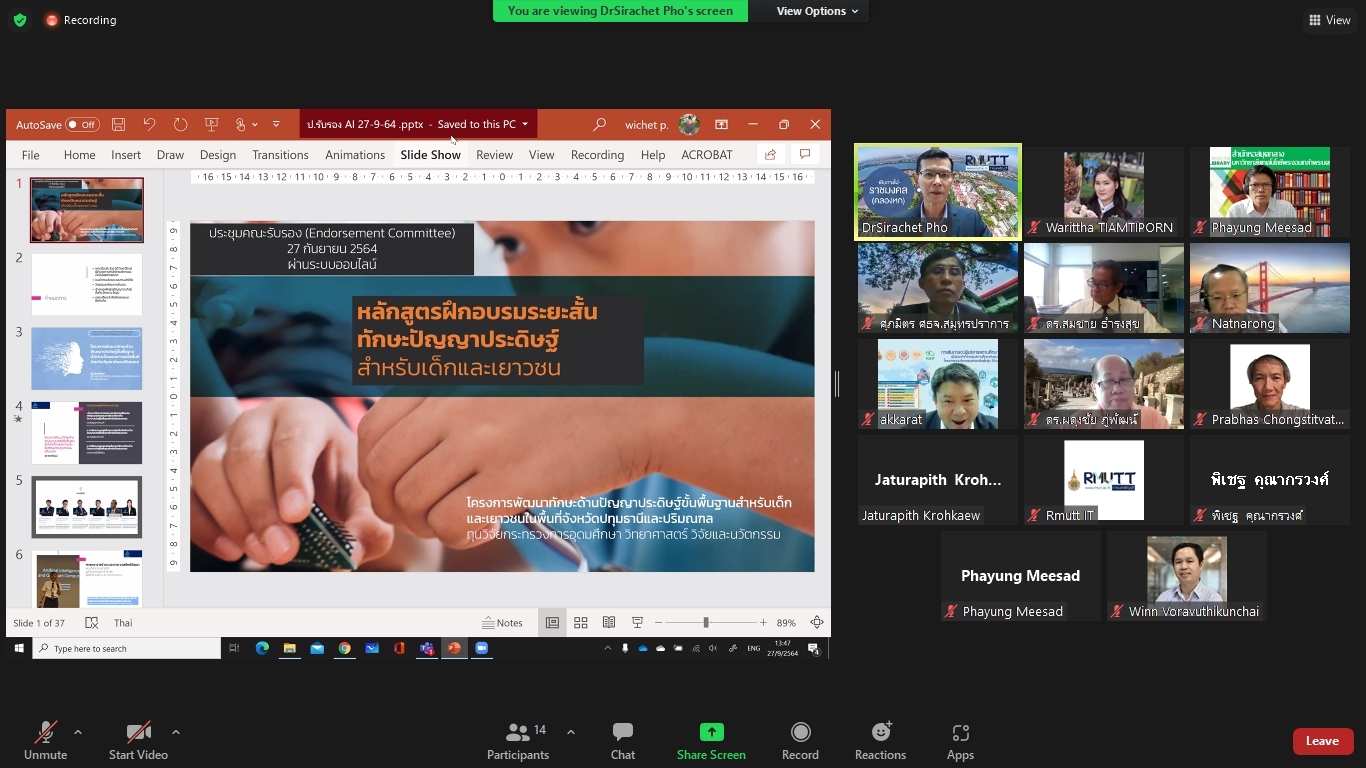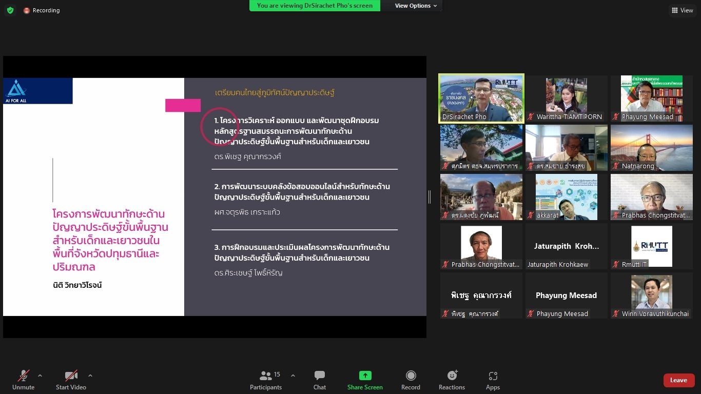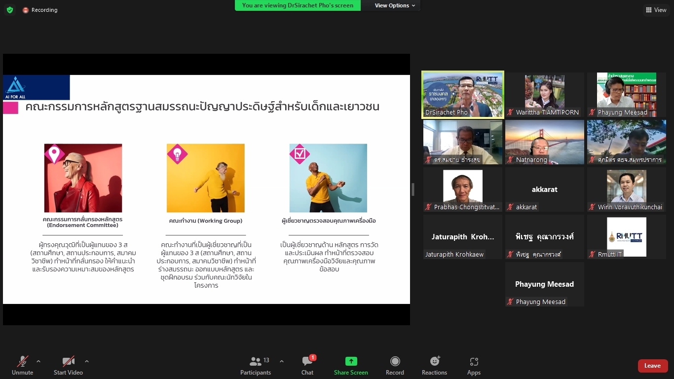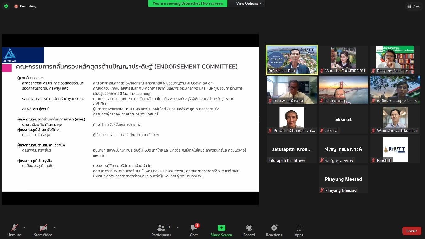 คณะผู้วิจัยโครงการพัฒนาทักษะด้านปัญญาประดิษฐ์ขั้นพื้นฐานสำหรับเด็กและเยาวชนในพื้นที่จังหวัดปทุมธานีและปริมณฑล ได้จัดประชุมคณะรับรอง (Endorsement Committee) หลักสูตรฐานสมรรถนะการพัฒนาทักษะด้านปัญญาประดิษฐ์ขั้นพื้นฐานสำหรับเด็กและเยาวชน ในวันที่ 27 กันยายน 2564 เวลา 13.30 – 16.30 น. ผ่านการประชุมออนไลน์ ZOOM meeting โดยมีผู้เข้าร่วมการประชุมหลักสูตรฐานสมรรถนะการพัฒนาทักษะด้านปัญญาประดิษฐ์ขั้นพื้นฐานสำหรับเด็กและเยาวชน ดังนี้