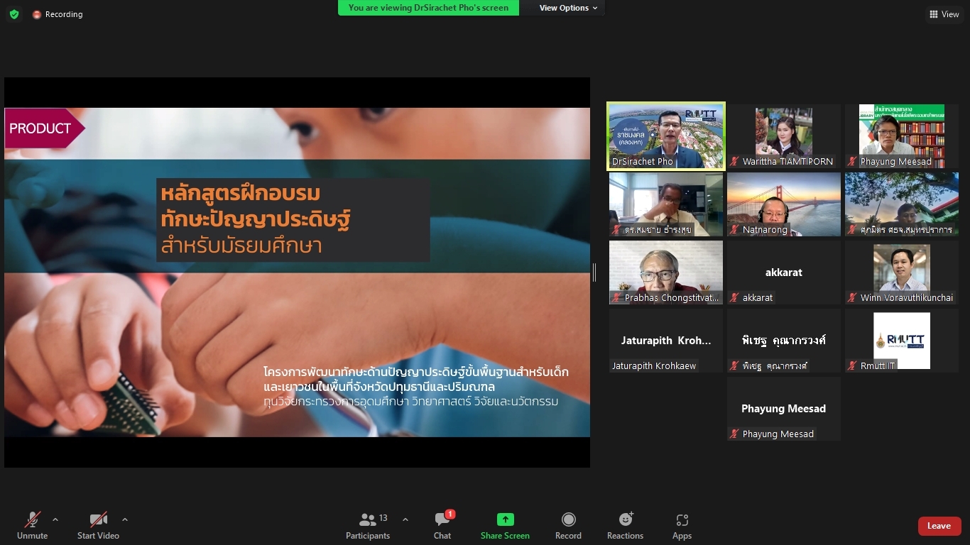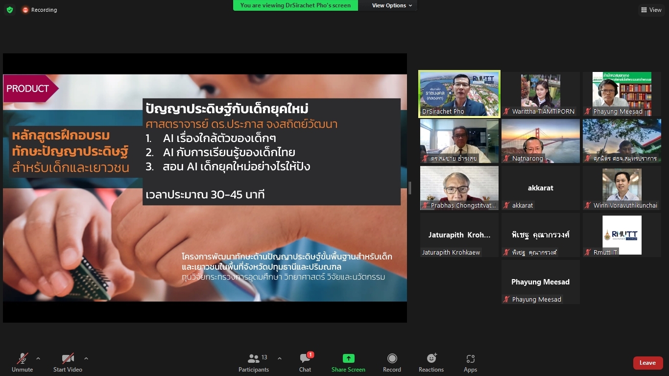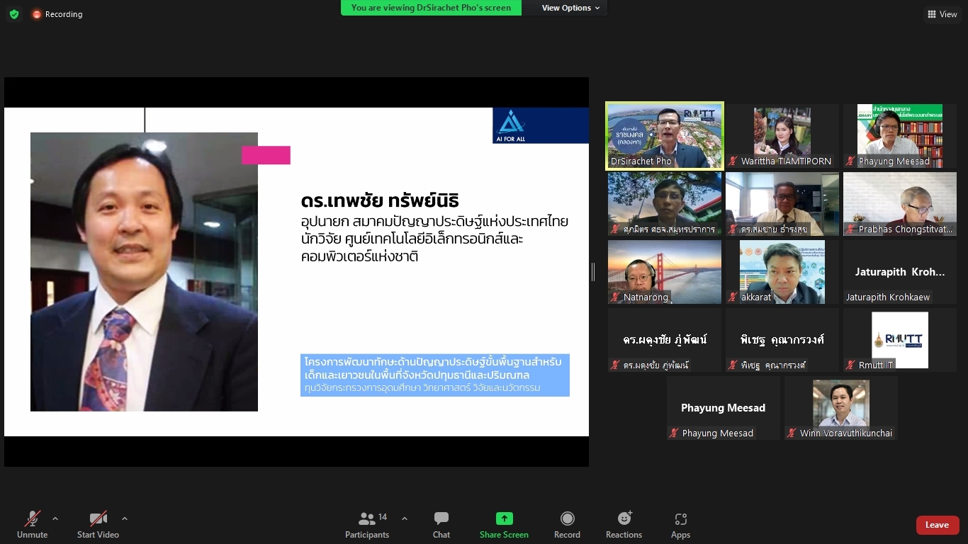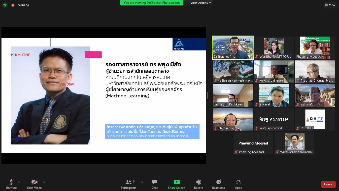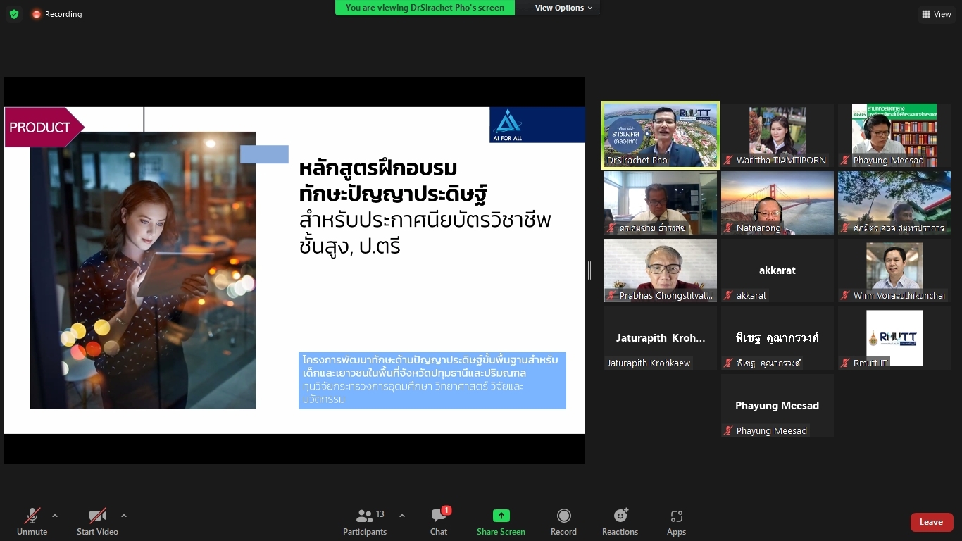 คณะผู้วิจัยโครงการพัฒนาทักษะด้านปัญญาประดิษฐ์ขั้นพื้นฐานสำหรับเด็กและเยาวชนในพื้นที่จังหวัดปทุมธานีและปริมณฑล ได้จัดประชุมคณะรับรอง (Endorsement Committee) หลักสูตรฐานสมรรถนะการพัฒนาทักษะด้านปัญญาประดิษฐ์ขั้นพื้นฐานสำหรับเด็กและเยาวชน ในวันที่ 27 กันยายน 2564 เวลา 13.30 – 16.30 น. ผ่านการประชุมออนไลน์ ZOOM meeting โดยมีผู้เข้าร่วมการประชุมหลักสูตรฐานสมรรถนะการพัฒนาทักษะด้านปัญญาประดิษฐ์ขั้นพื้นฐานสำหรับเด็กและเยาวชน ดังนี้