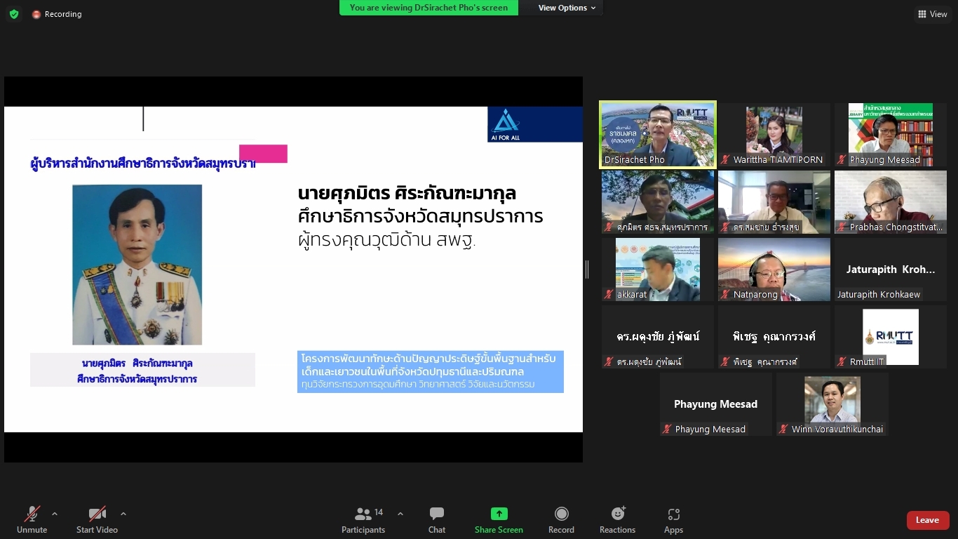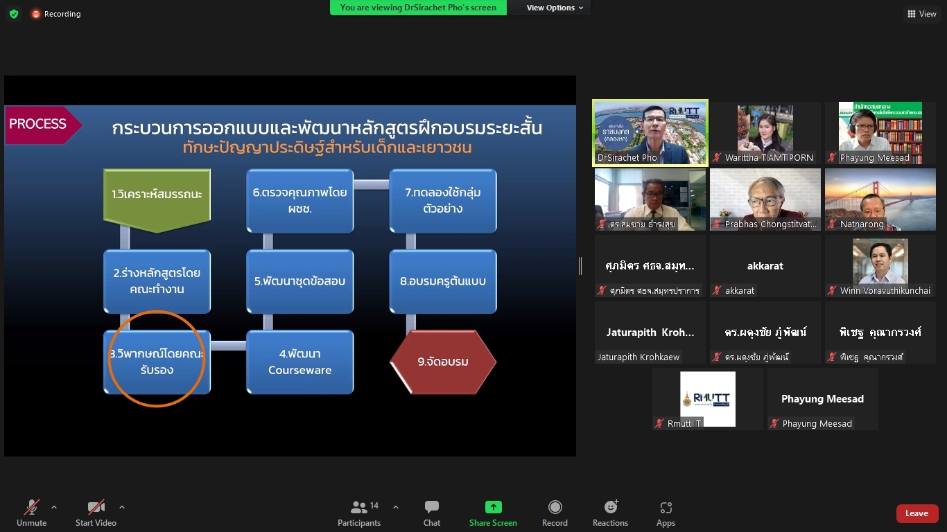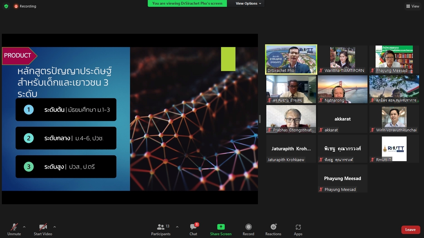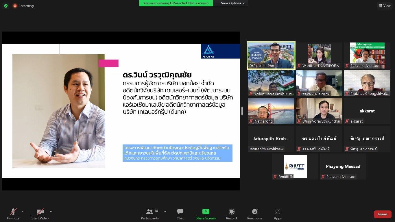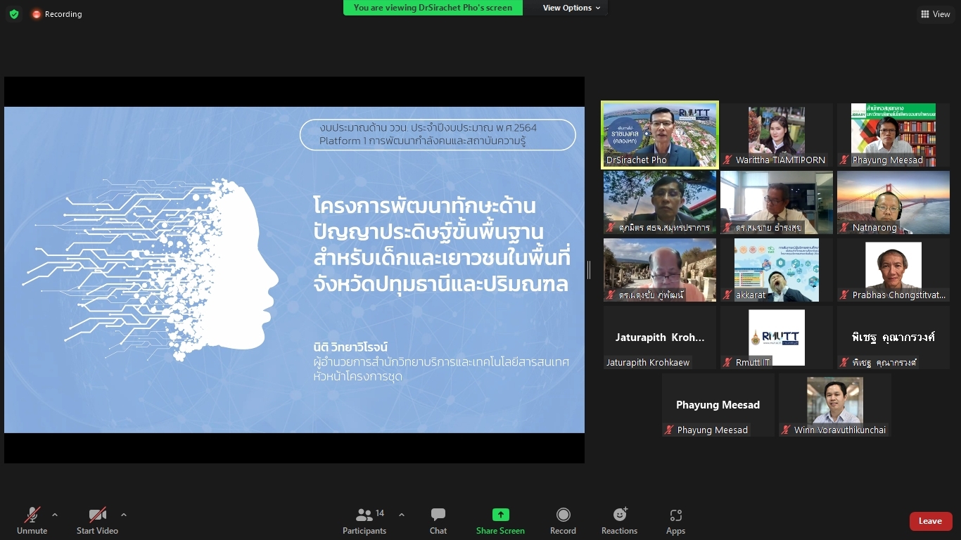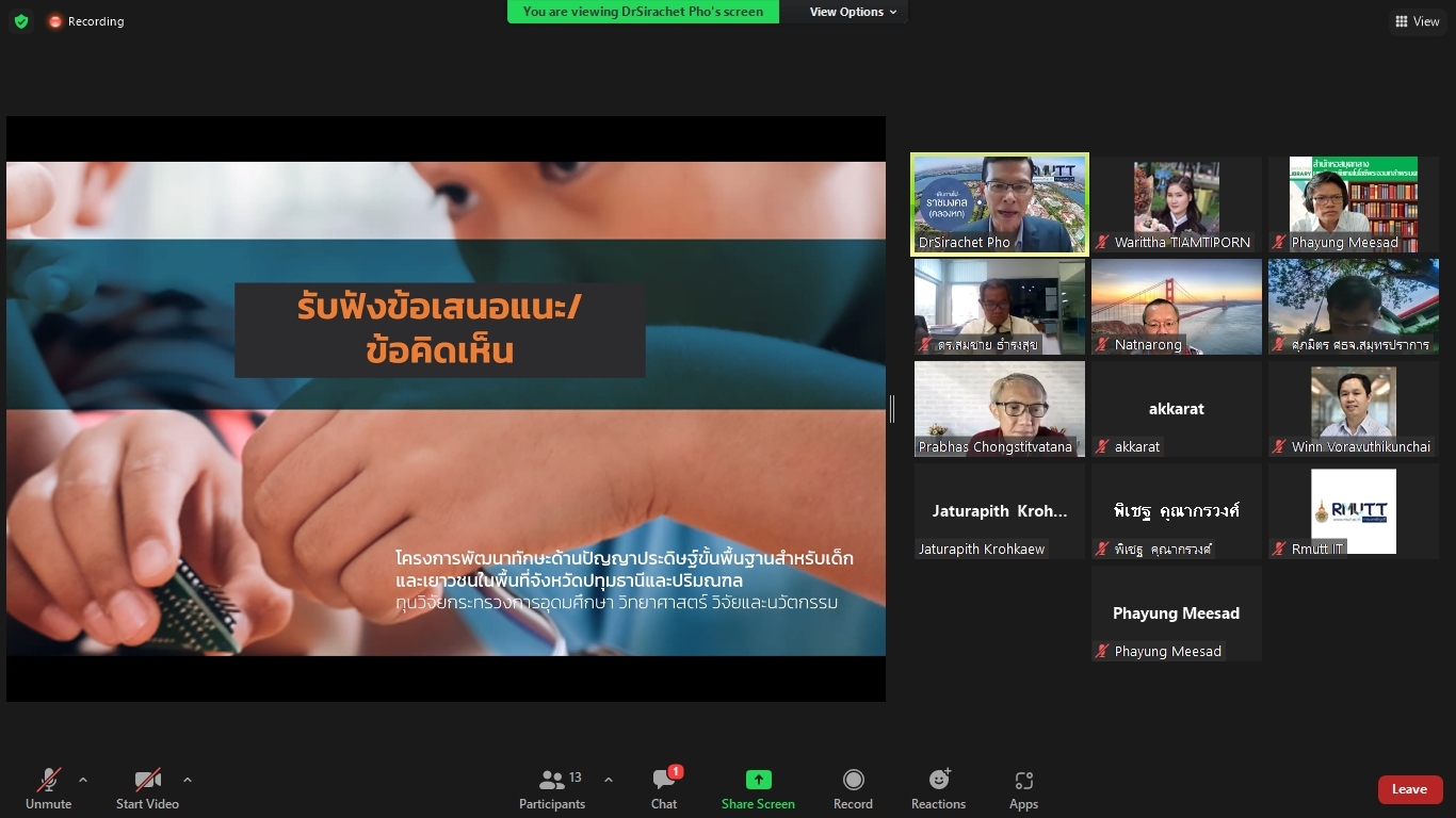คณะผู้วิจัยโครงการพัฒนาทักษะด้านปัญญาประดิษฐ์ขั้นพื้นฐานสำหรับเด็กและเยาวชนในพื้นที่จังหวัดปทุมธานีและปริมณฑล ได้จัดประชุมคณะรับรอง (Endorsement Committee) หลักสูตรฐานสมรรถนะการพัฒนาทักษะด้านปัญญาประดิษฐ์ขั้นพื้นฐานสำหรับเด็กและเยาวชน ในวันที่ 27 กันยายน 2564 เวลา 13.30 – 16.30 น. ผ่านการประชุมออนไลน์ ZOOM meeting โดยมีผู้เข้าร่วมการประชุมหลักสูตรฐานสมรรถนะการพัฒนาทักษะด้านปัญญาประดิษฐ์ขั้นพื้นฐานสำหรับเด็กและเยาวชน ดังนี้