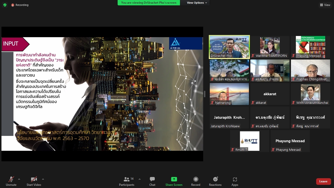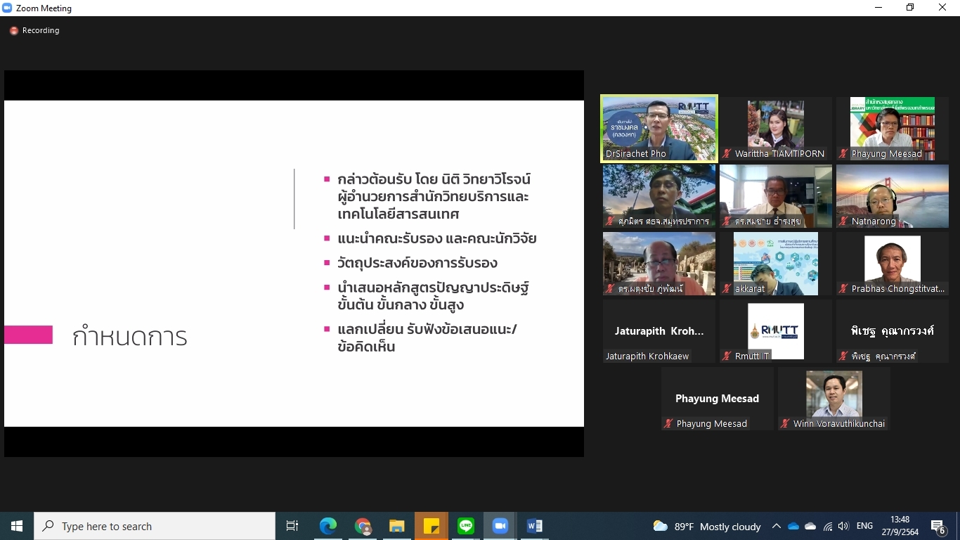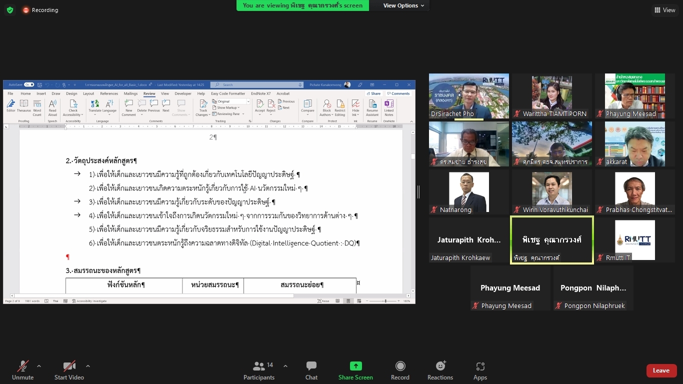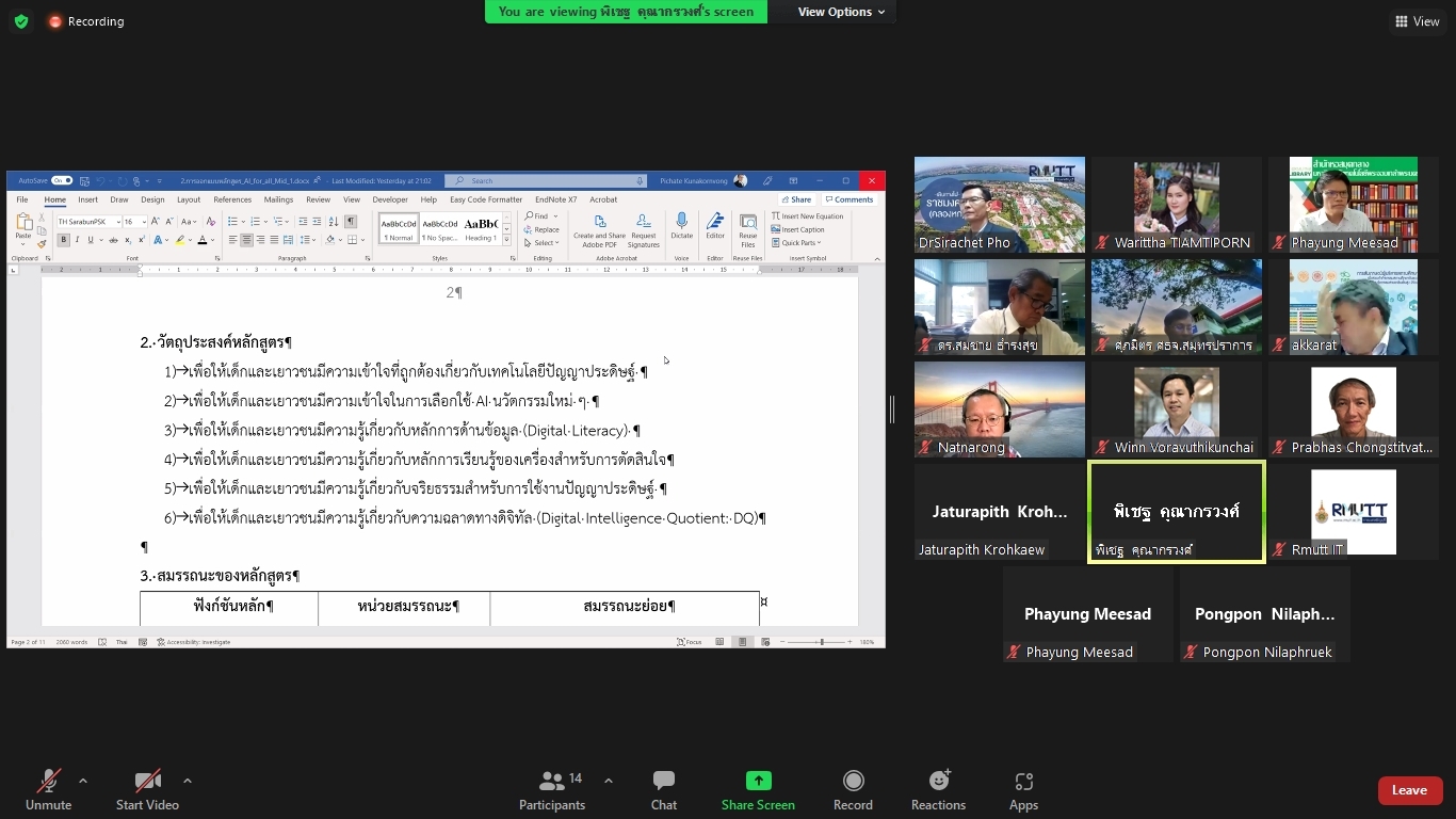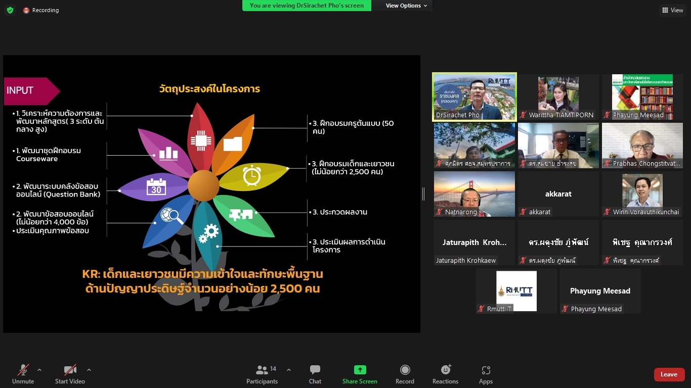 คณะผู้วิจัยโครงการพัฒนาทักษะด้านปัญญาประดิษฐ์ขั้นพื้นฐานสำหรับเด็กและเยาวชนในพื้นที่จังหวัดปทุมธานีและปริมณฑล ได้จัดประชุมคณะรับรอง (Endorsement Committee) หลักสูตรฐานสมรรถนะการพัฒนาทักษะด้านปัญญาประดิษฐ์ขั้นพื้นฐานสำหรับเด็กและเยาวชน ในวันที่ 27 กันยายน 2564 เวลา 13.30 – 16.30 น. ผ่านการประชุมออนไลน์ ZOOM meeting โดยมีผู้เข้าร่วมการประชุมหลักสูตรฐานสมรรถนะการพัฒนาทักษะด้านปัญญาประดิษฐ์ขั้นพื้นฐานสำหรับเด็กและเยาวชน ดังนี้